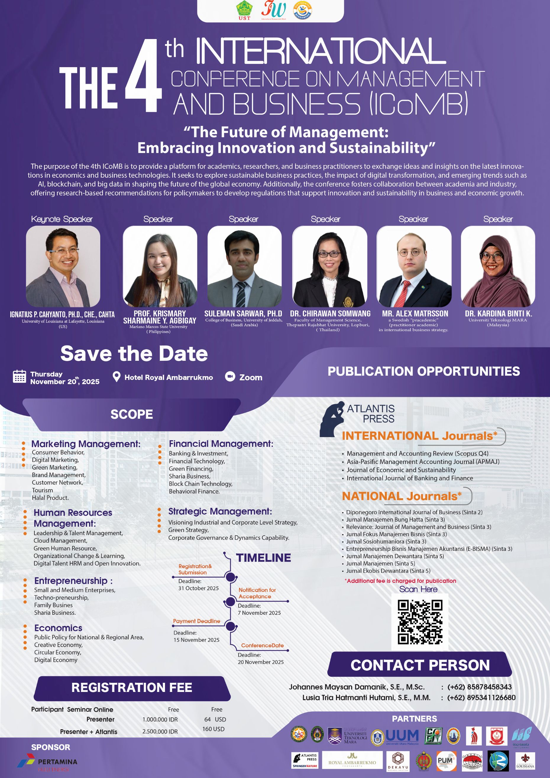 With the utmost respect and sincere appreciation, I wish to extend my highest gratitude for the extraordinary dedication, intellectual rigor, and collective spirit that you have demonstrated in realizing the success of International Management Week (IMW) 2024. My heartfelt thanks go to the Rector of Universitas Sarjanawiyata Tamansiswa (UST) for entrusting us with the stewardship of this prestigious platform, as well as to the entire organizing committee, whose meticulous planning, tireless enthusiasm, and solid collaboration have transformed a shared vision into a remarkable reality.
