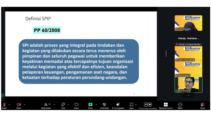 Pada sesi pemaparan materi, pemateri menjelaskan secara umum mengenai konsep dan peran audit internal dalam organisasi, khususnya dalam mendukung tata kelola yang baik, manajemen risiko, dan pengendalian internal. Selain itu, disampaikan pula tahapan utama dalam proses penugasan audit internal yang meliputi perencanaan audit, penyusunan program audit, pelaksanaan prosedur audit, pengumpulan dan analisis bukti audit, hingga perumusan temuan dan rekomendasi.