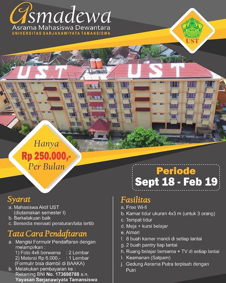 Universitas Sarjanawiyata Tamansiswa (UST) berkomitmen demi menunjang proses suasana untuk mahasiswa belajar yang kondusif, disamping fakultas sudah memiliki kampus masing-masing, UST juga memiliki asrama mahasiswa dewantara (asmadewa) yang di peruntukan bagi prioritas calon mahasiswa baru dengan berbagai fasilitas yang lengkap dan nyaman . .